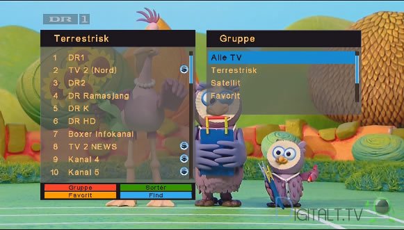 Ved at trykke på OK knappen vises kanallisten, hvilken giver dig mulighed for at navigere rundt i alle de mange kanaler, som hurtigt kommer til at ligge på modtageren, hvis du har mere end én signalkilde. Så derfor er det også fint, at der er sorteringsmulighed i forhold til signaltype, alfabetisk, udbyder osv.