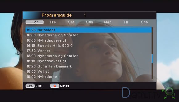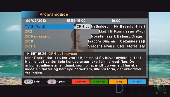 Den elektroniske programguide vises på enten tidslinje eller enkeltkanal liste form. Desværre så udnytter boksen på ingen måde hele skærmen, så specielt tidslinje visning bliver meget sammenpresset og ikke specielt brugervenligt. Det kan gøres meget bedre.