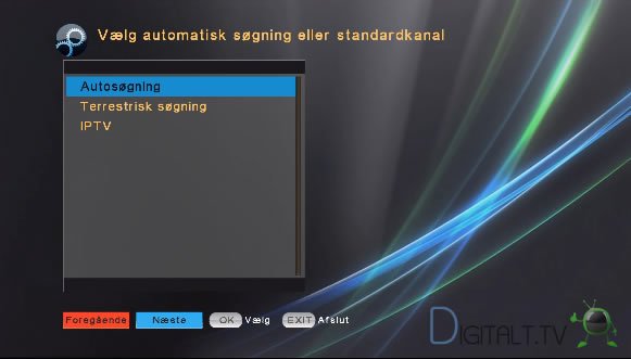 Installationsguiden funger fornuftigt med valg af menusprog (dansk + rigtig mange andre) og skærmtype og format. Man bliver i denne guide herefter mødt af 3 valgmuligheder i forhold til opsætning af: Satellit, Antenne eller IPTV.