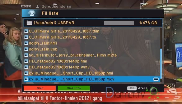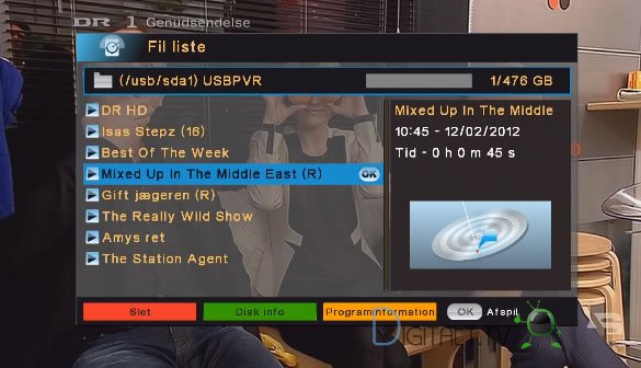 Overblikket over optagelser sker ved tryk på file knappen på fjernbetjeningen. Optagelser vises i en liste med titel og dato information. Der er desværre ingen sorteringsmulighed i denne liste, der bare vises i med nyeste optagelser først. Positionen i de afspilningen huskes, så du kan afbryde en afspilning og genoptage senere fra samme sted du kom til.