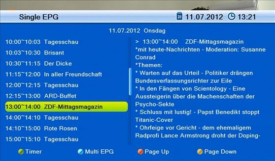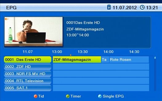 EPG information kan læses som enkeltkanal EPG eller multikanal EPG, begge er ikke super overskuelig i design og præsentation. Der er mulighed for at oprette timere for programmer, selv om modtageren altså ikke kan optage tv på eksternt USB medie.