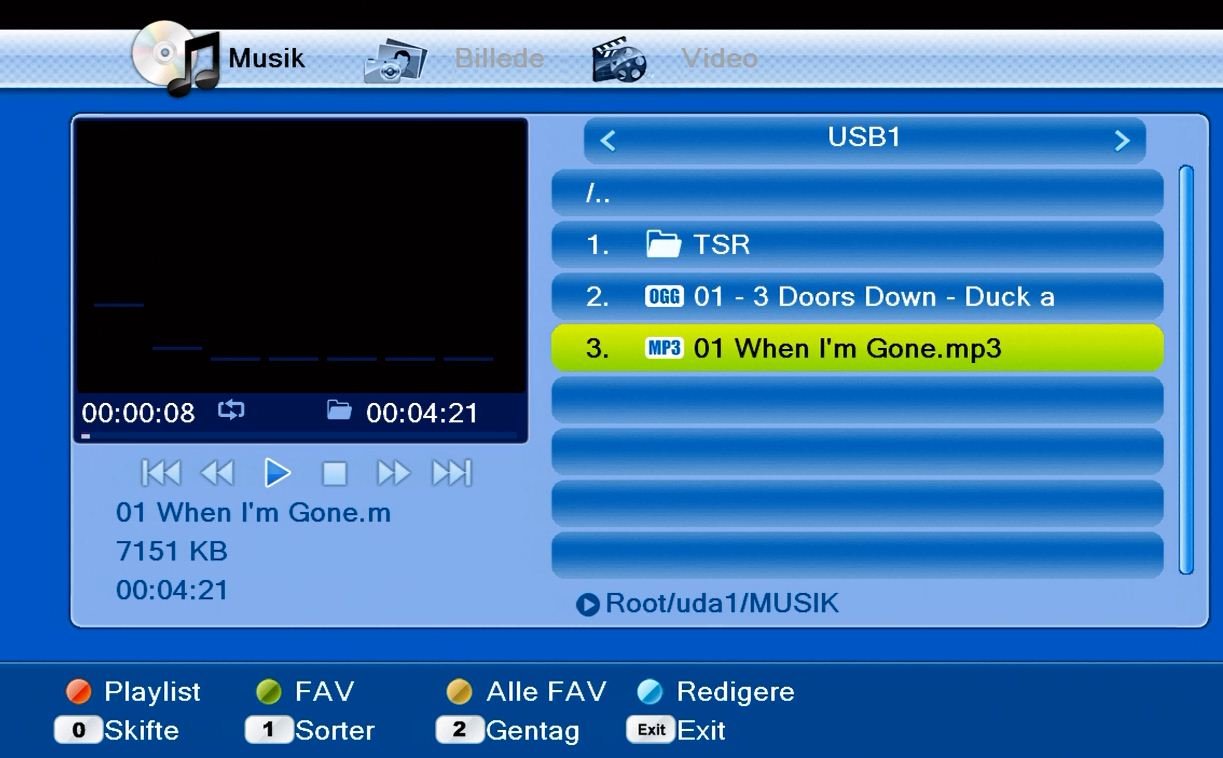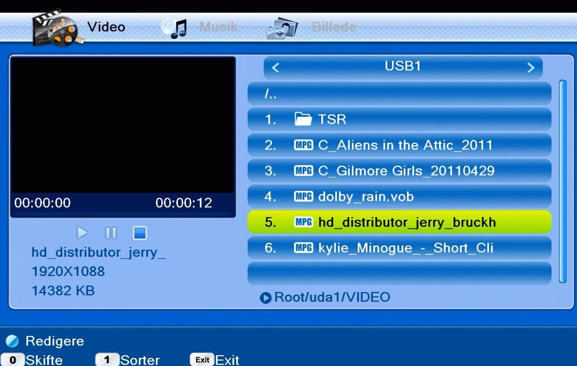 Tilslutter du en USB enhed til USB indgangen på modtageren, så kan du afspille mp3 filer, jpg filer og mpg filer på modtageren. Udvalget af hvad der kan afspilles er naturligvis ikke som en dedikeret medieafspiller men fint nok med muligheden.