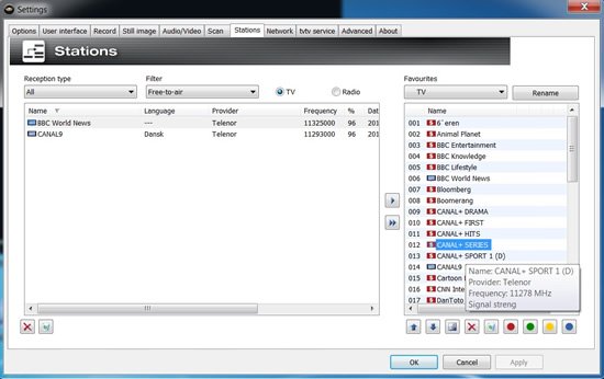 Under stations er det muligt at lave 4 favoritlister under de fire farver rød, grøn, gul og blå på fjernbetjeningen. Der er indbygget tekst-tv, der er hurtigt med sidehukommelse. Der er i indstillingerne mulighed for at aktivere dekodning af flere end ‘en kanal. I praksis kunne jeg se én kanal og optage en anden samtidigt, dog med lidt hakken i optagelsen, når jeg skiftede kanal. Så det kan nok ikke anbefales. Eftersom produktet her kun er med en enkelt tuner, så skal begge kanaler sende på samme frekevens, for at det overhovedet kan lade sig gøre.