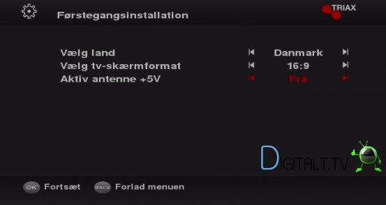 Installationsguiden funger ganske som den skal med valg af menusprog (Dansk, Svensk, Engelsk) og derefter land og skærmformat.