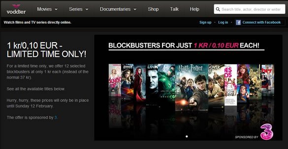 Voddler, der er Skandinaviens førende video-on-demand tjeneste, tilbyder nu i samarbejde med mobiloperatøren 3, 12 blockbuster film for kun 1 kr. pr. stk. i løbet af de næste 10 dage.