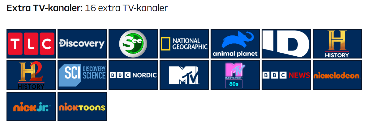 - «Basic»-pakken + to ekstra tilbud (streamingtjenester og/eller en pakke med ekstra TV-kanaler). Du kan vælge at udskifte tjenesterne fra måned til måned.