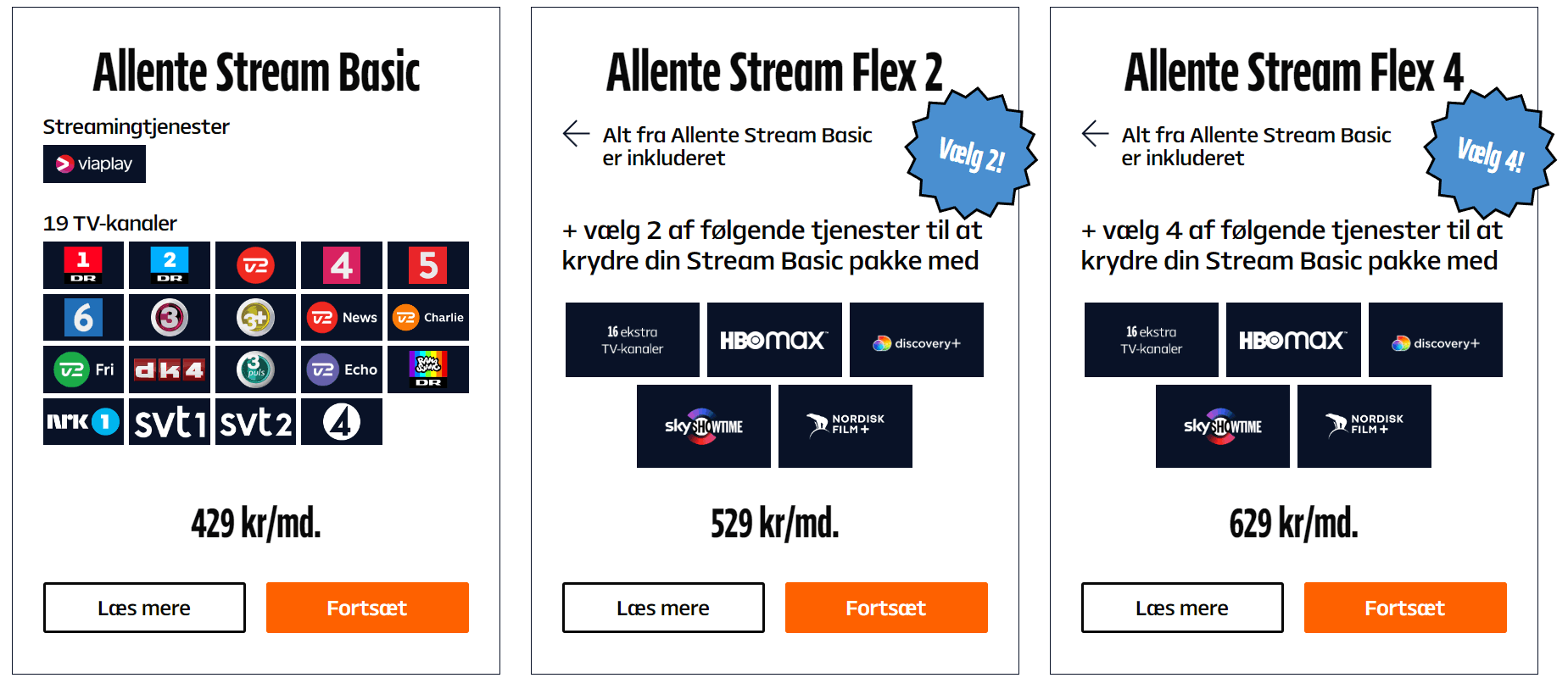 - «Basic»-pakken + fire ekstra tilbud (streamingtjenester og/eller en pakke med ekstra TV-kanaler). Du kan vælge at udskifte tjenester fra måned til måned.