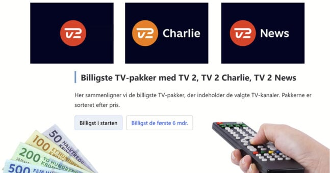 Men hvad er den billigste TV-pakke, hvis du vil have netop TV 2, TV 2 Charlie og TV 2 News? Det ser vi nærmere på i denne prissammenligning, hvor vi sammenligner aktuelle TV-pakker, der indeholder alle tre kanaler.