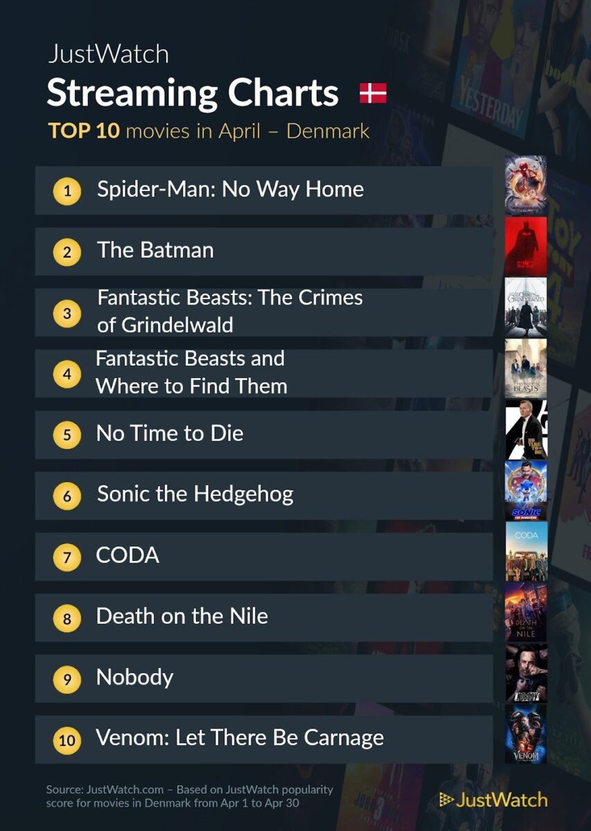 Indholdssøgetjenesten JustWatch har for DIGITALT.TV kigget på interessen for streamingtitler i april måned. Du kan finde top 10 lister for film og serier herunder.
