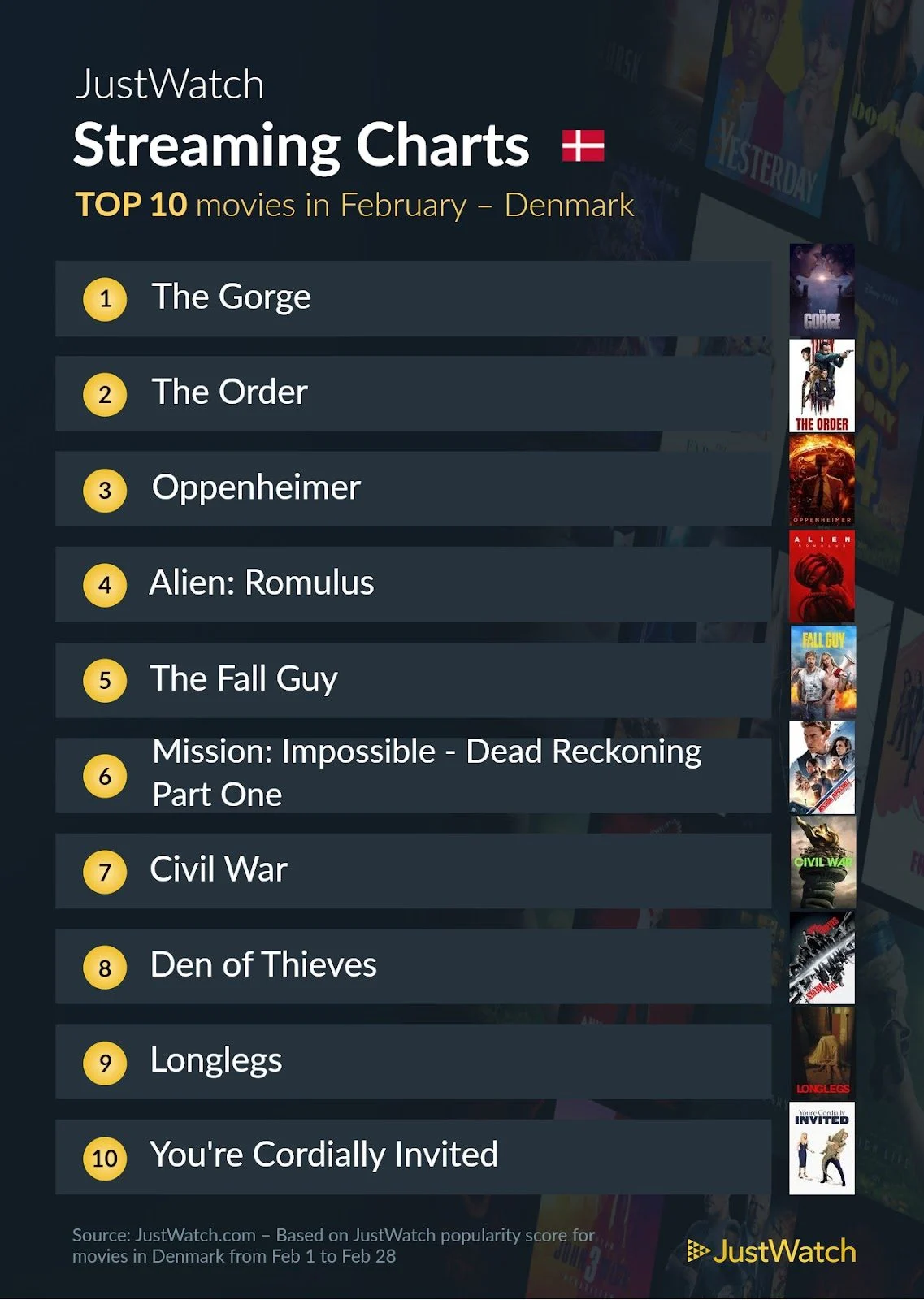 Apple TV+ filmen The Gorge var efterspurgt i februar, mens Prime Video filmen The Order også var efterspurgt.
