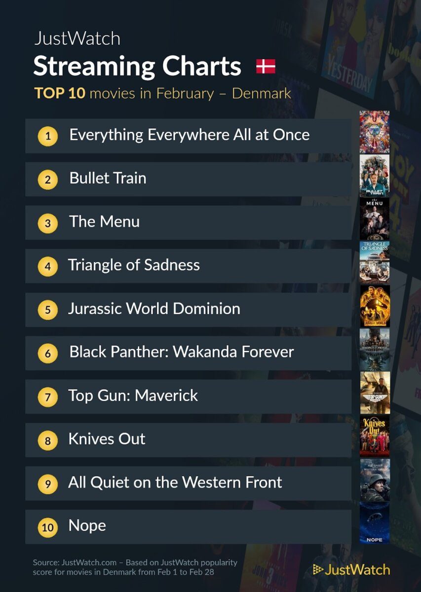 Søgetjenesten JustWatch har igen tjekket op på, hvad de danske brugere af tjenesten har søgt efter. Filmen Everything Everywhere All at Once fik hele 11 Oscar nomineringer, og det gjorde filmen til den mest søgte i februar på JustWatch.