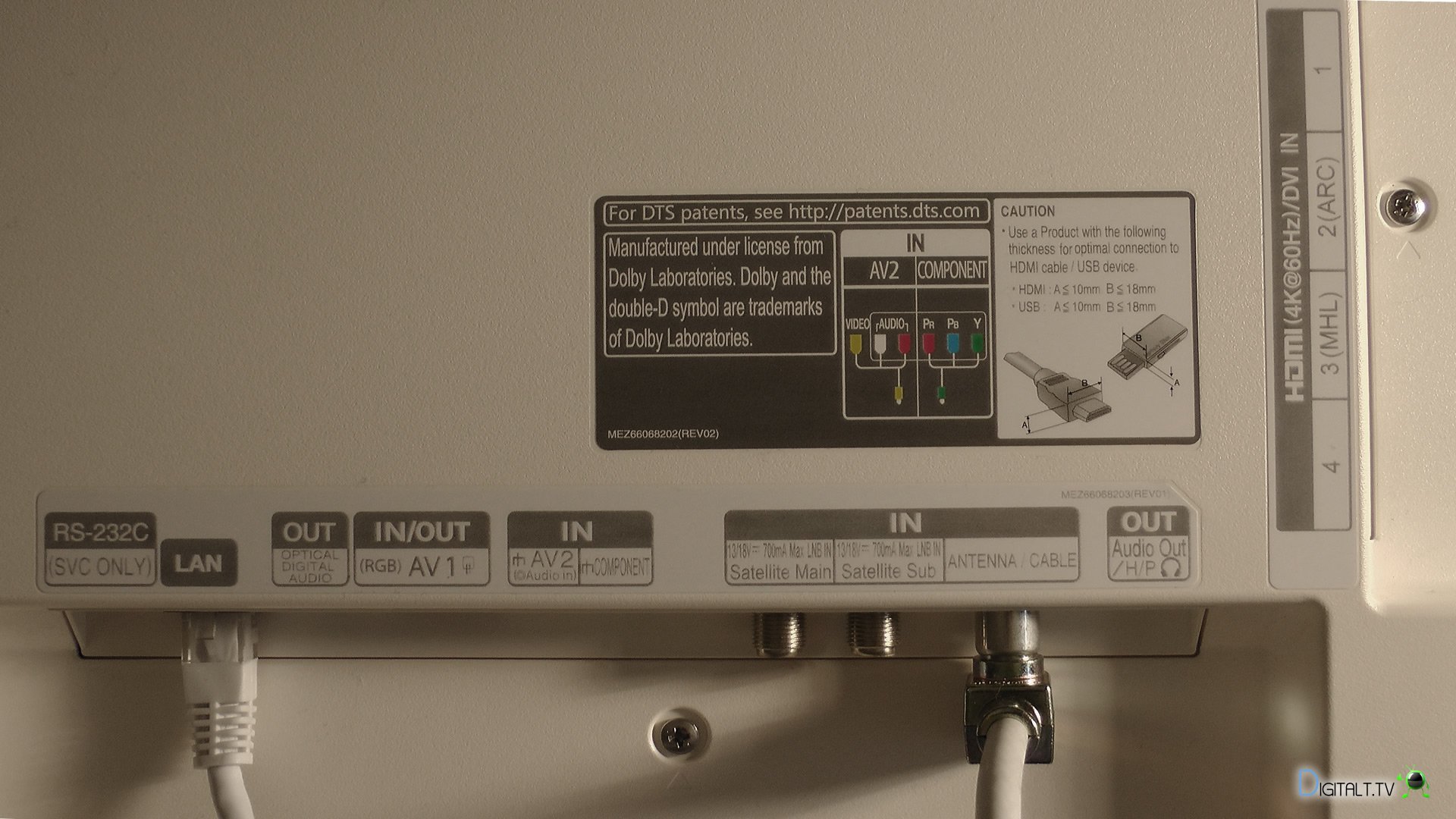 Tunerindgange, HDMI og USB tilslutningerne sidder samlet og er placeret, så de peger ned af eller til siden. Det er optimalt i forhold til at sikre, at der ikke er noget der stikker bagud ved vægmontering. Eneste stik der stikker lidt ud er strømstikker, der dog er et vinkelstik.