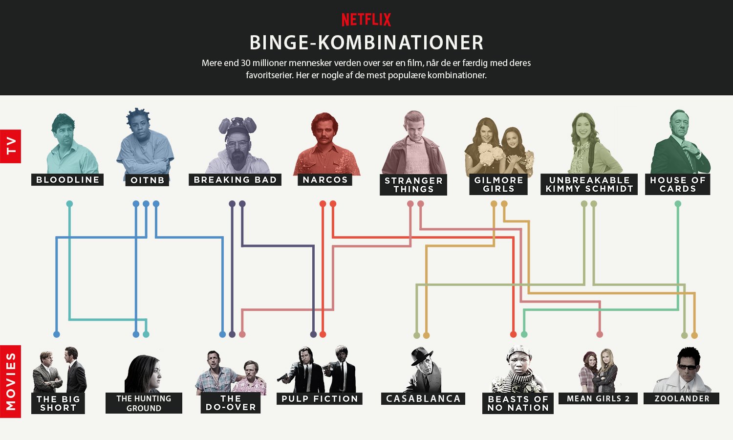 Eksempelvis er der blandt Netflix-seere en tendens til, at det politiske drama ’House of Cards’ efterfølges af ’Beasts of No Nation’ – to fortællinger, der centrerer om kompromisløse og ubarmhjertige ledere. Og efter at være blevet konfronteret med social uretfærdighed og sørgelige skæbner i ’Making a Murderer’ rykker mange seere videre til ’The Hunting Ground’. På samme måde betyder Vince Gilligans bifald til Tarantino i ’Breaking Bad, at mange seere herefter nyder et gensyn med ’Pulp Fiction’, når ’Breaking Bad’ er set til ende. Og fans af den hurtigsnakkende mor-datter-duo fra ’Gilmore Girls’ vælger at gense klassikere som ’Breakfast at Tiffany’s’ og ’Casablanca’.