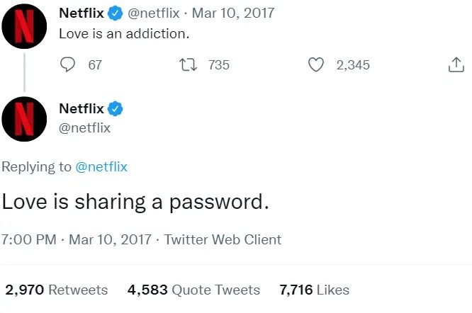 Da Netflix serien “Love” blev lanceret tilbage i 2017, så kunne man på Netflix’s Twitterkonto læse opslaget “Love is sharing a password“.