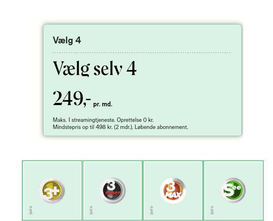 Samme kanaler hos YouSee Play kræver 23 point, altså mindst 499,- / måned for 30 point pakken, hvor der så er 7 point tilbage til andet indhold.