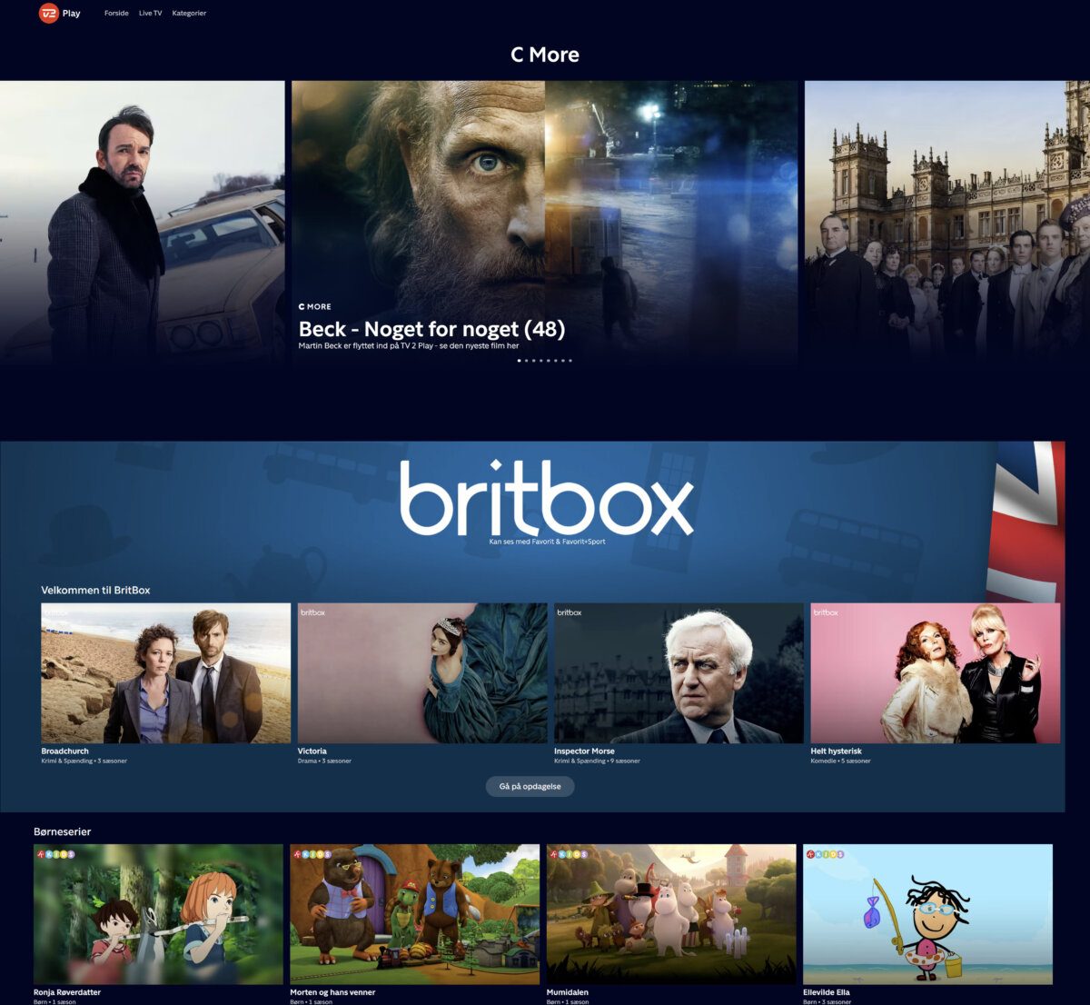 - C More / SF Kids og Britbox via TV 2 Play fås i TV 2 Play Favorit+Sport med/uden reklamer 189,- / 219,- månedligt