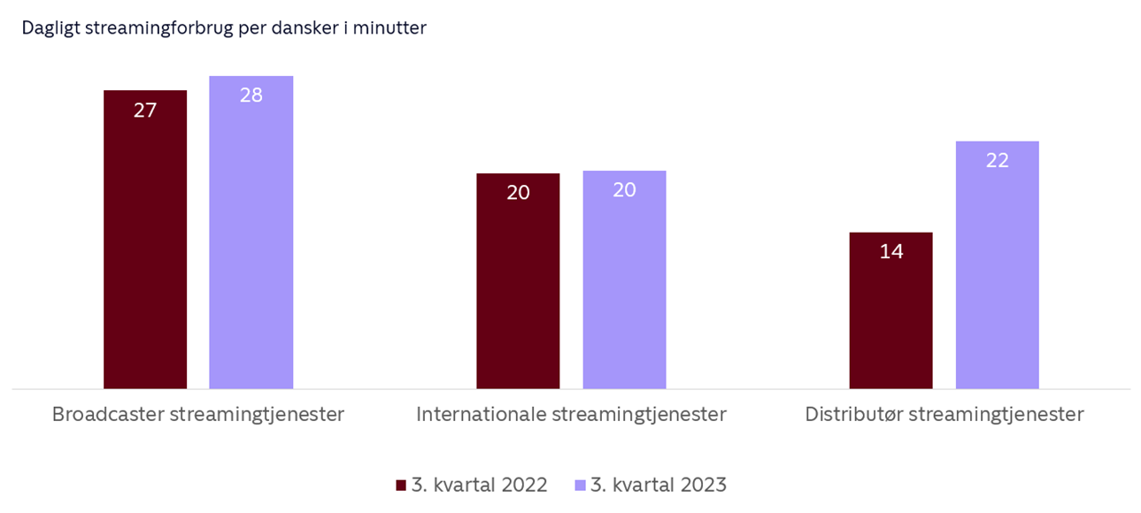 Ser man bort fra forbruget via distributørerne, og fokuserer udelukkende på de internationale samt broadcasternes streamingtjenester, tegner der sig et billede af et streamingforbrug, der er nogenlunde på niveau med tredje kvartal sidste år. Hvor de internationale streamingtjenester samlet er på niveau, ser vi imidlertid en stigning på ét dagligt minut samlet set på broadcasternes streamingtjenester.
