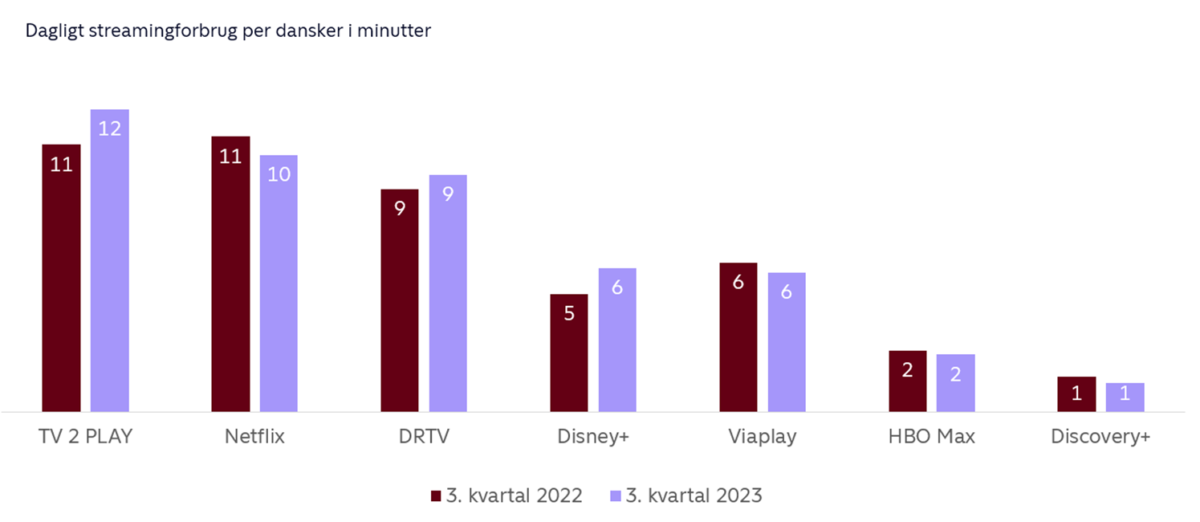 Blandt de største streamingtjenester i markedet, hvis man ser bort fra distributørernes streamingtilbud, finder vi nedgang hos Netflix. Det skyldes særligt, at de 20-40-årige bruger cirka fire minutter mindre dagligt på Netflix. Samtidig ser vi en stigning i forbruget hos Disney+- især blandt de alleryngste, hvormed det samlede forbrug hos de internationale streamingtjenester ender på niveau med tredje kvartal sidste år.