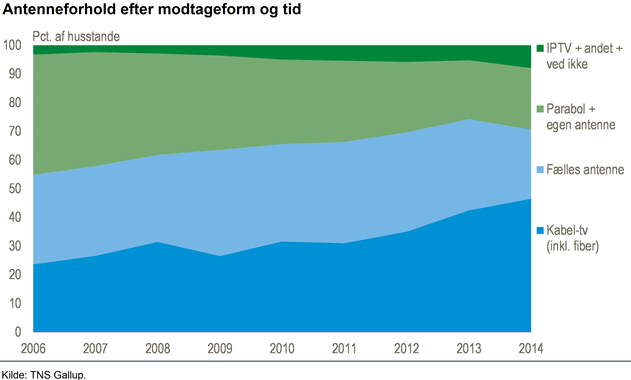Danskernes foretrukne distributionsform af tv-signaler er fra enten kabel-tv eller fællesantenne. Tilsammen får syv ud af ti husstande leveret tv-signalet fra enten kabel eller fællesantenne. Tallet er fra 2006 vokset fra 55 pct. til 2013, hvor det toppede med 74 pct. af husstandene, hvorefter det faldt til det nuværende niveau.