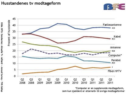 2011 tallene viser stabilitet for fællesantenneanlæg, fald for kabel og parabol, og opsving for antenne og fiber/IPTV, men det er fortsat kabel-tv, som er den suverænt foretrukne modtageform.