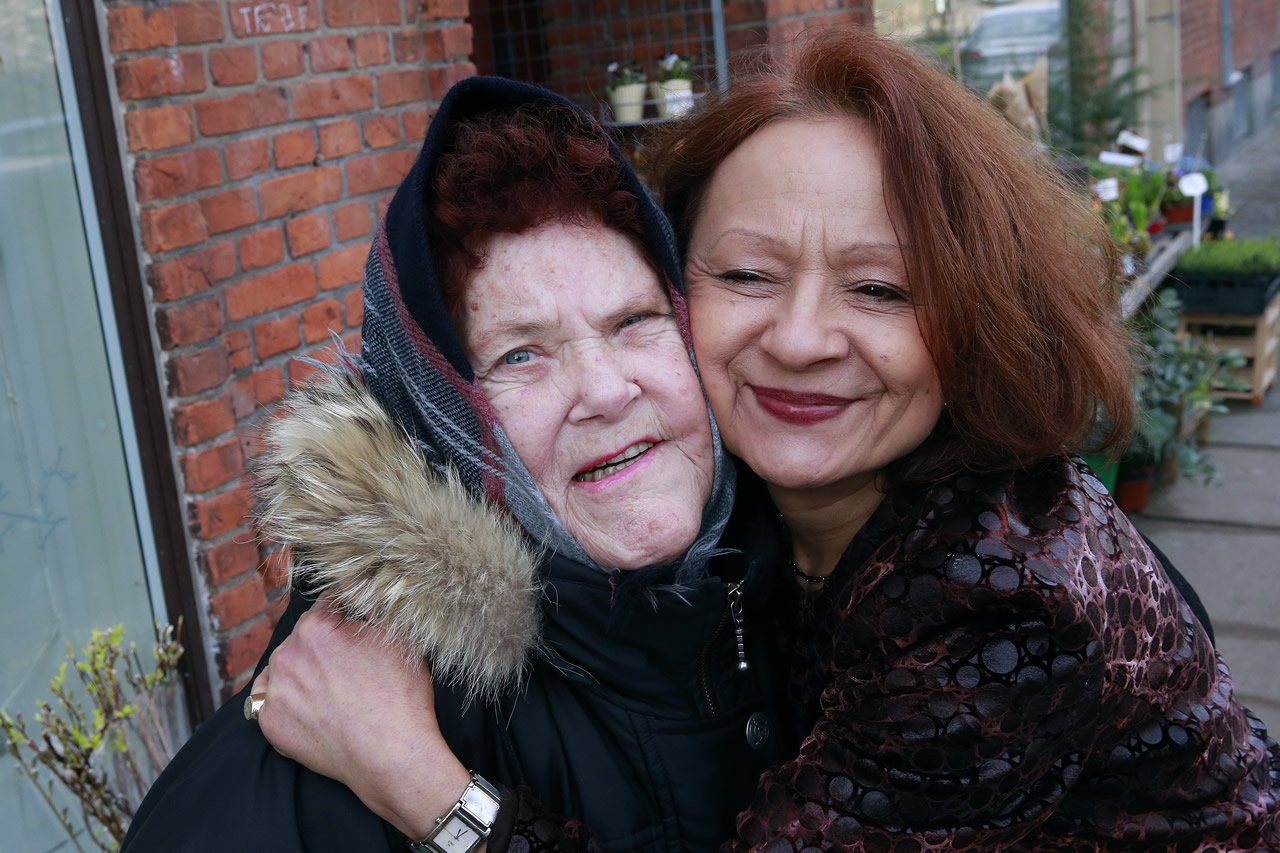 “Hun er vores allesammens lille mor”, fortæller John, der holder til på en grøn ølkasse på fortovet overfor.