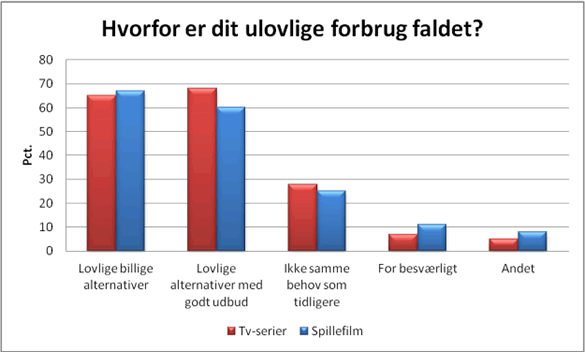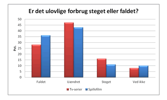 - Mellem 28 og 36 pct. af dem, der erkender at have et ulovligt forbrug, siger, at de gør det mindre sammenlignet med samme tidspunkt sidste år. (Tallet 36 pct. gælder for forbrug af film, mens 28 pct. gælder for tv-serier).
