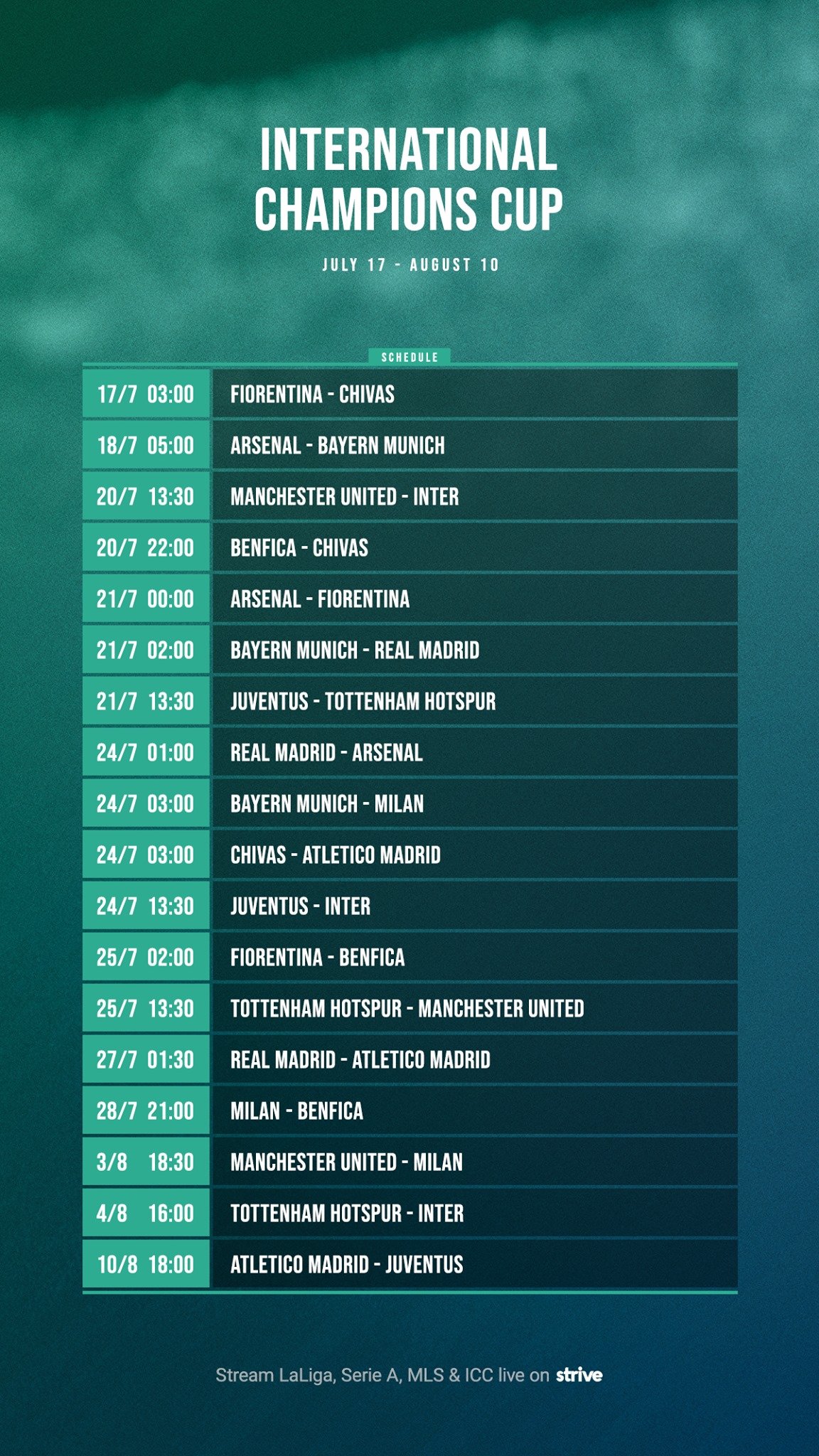 Fodboldfans kan på [Strivesport] følge deres favorithold i International Champions Cup, som spilles mellem den 17. juli og den 10. august. Turneringen har hurtigt fået status som den mest prestigefyldte sommerturnering med hold som Manchester United, Real Madrid, Juventus, Tottenham Hotspur, Arsenal, Bayern München, AC Milan og Roma. Den afsluttende kamp spilles på Friends Arena i Stockholm mellem Atlético Madrid og Juventus den 10. august.