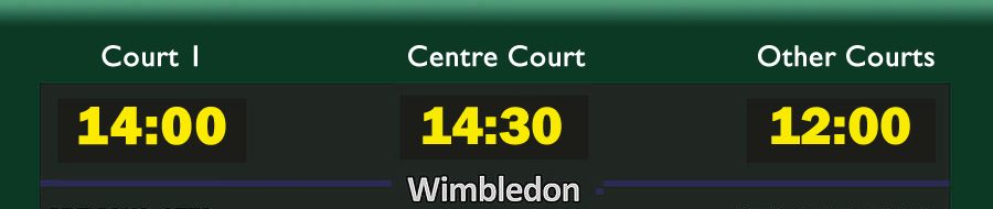 Kampene på hovedbanerne starter 14:00 (Court 1) 14:30 (Center Court). På de øvrige baner starter man 12:00.