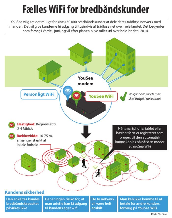 · Som udgangspunkt bliver alle bredbåndskunder med egnede modem automatisk sluttet til det fælles netværk. Hvis man ikke ønsker at deltage, skal man meddele det til YouSee.